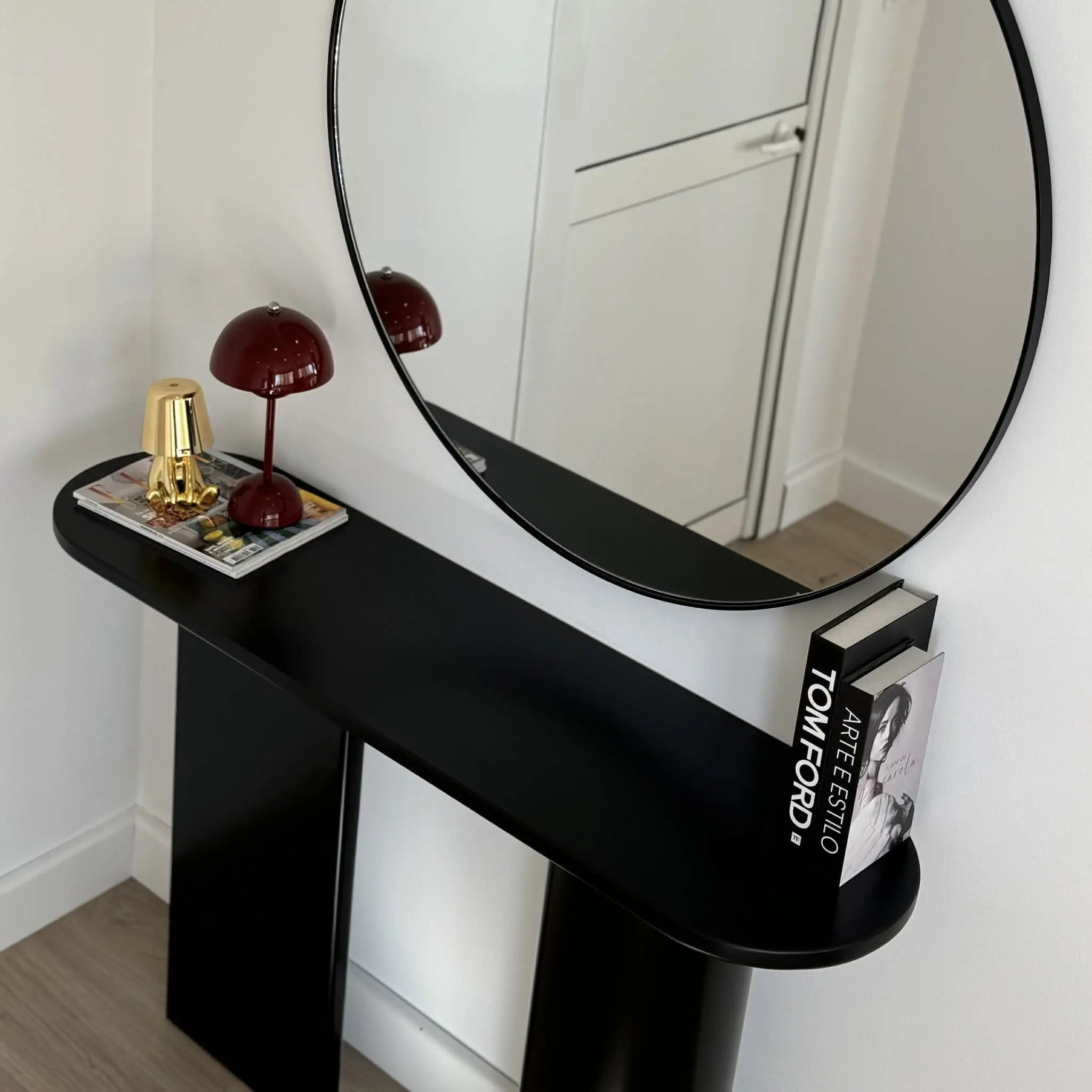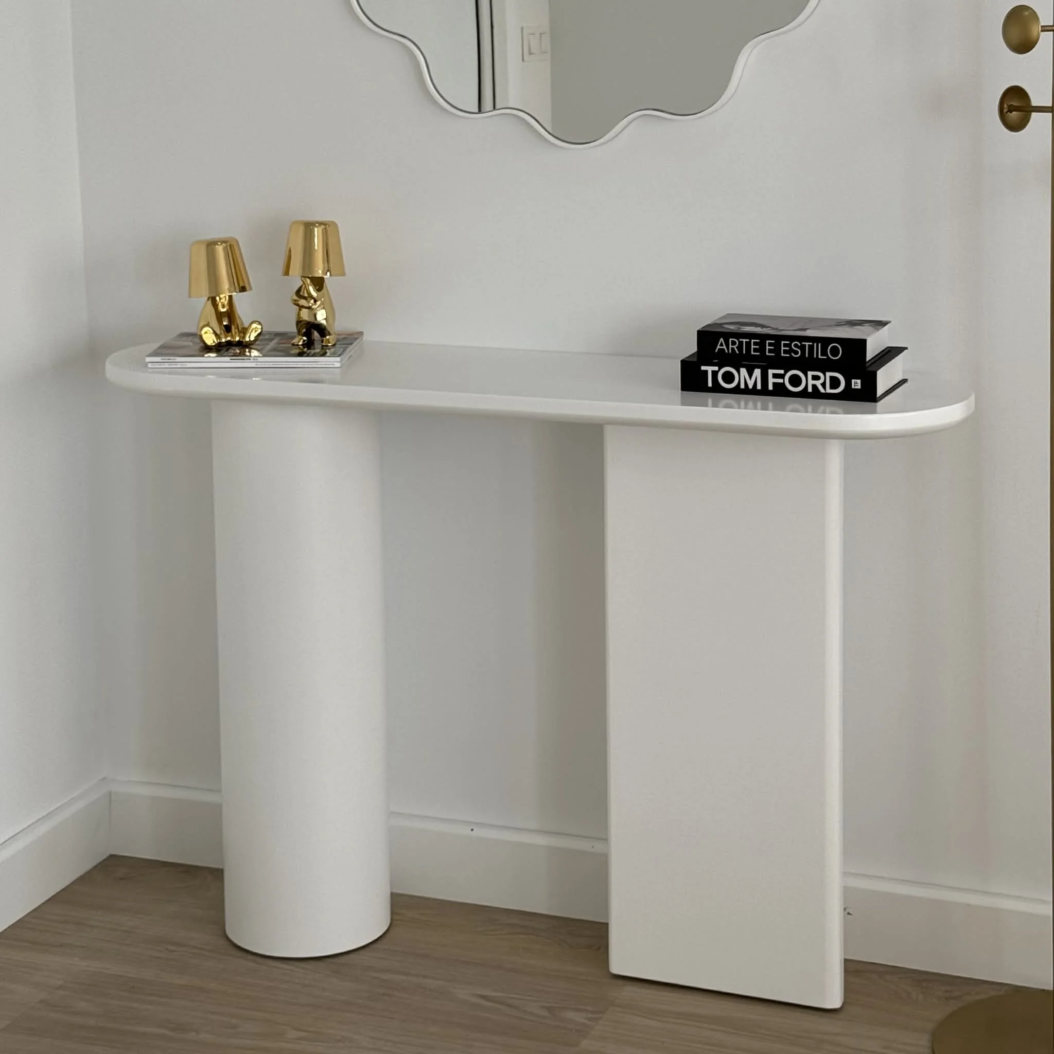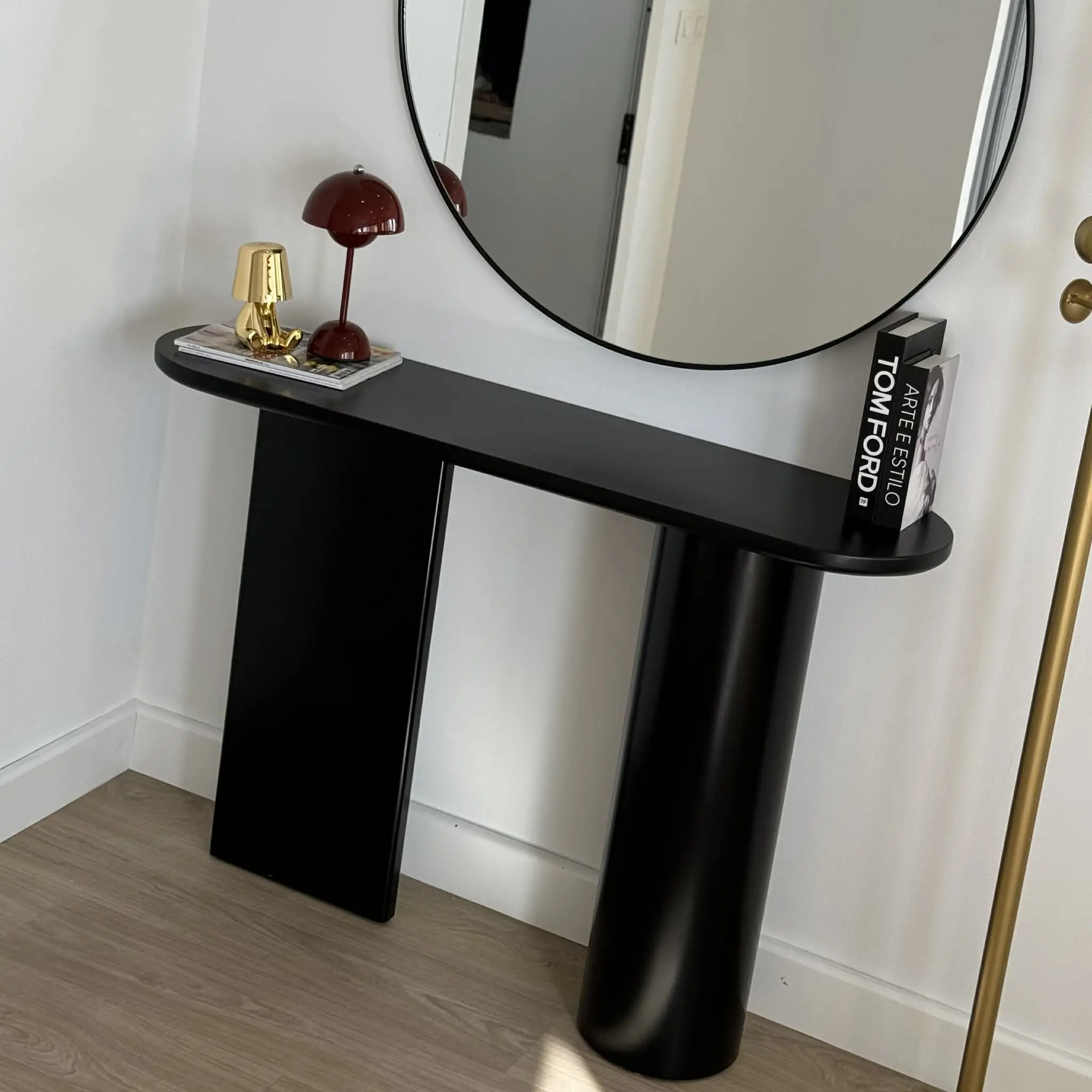 Apportez une touche de modernité élégante à votre intérieur avec cette console au design minimaliste et sculptural. Son plateau aux lignes douces repose sur deux pieds asymétriques — l’un cylindrique, l’autre rectangulaire — créant un équilibre parfait entre originalité et raffinement.